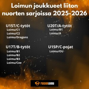 Aikuisten sarjoissa Loimulla on lähes 20v tauon jälkeen joukkue naisten 1-sarjassa. Kausi alkaa kotiottelulla 5.10. LP Vampula Akatemiaa vastaan klo 15. Lisäksi mukana ovat totutusti M2, N2 ja N3-joukkueet. Aikuisten sarjoissa pelaa myös kaksi juniorijoukkuetta, A1-tytöt ovat mukana 2-sarjassa ja B2-tytöt naisten 3-sarjassa. N1 ja M2 ovat mukana myös Suomen Cupissa. Molemmat pelaavat 1.kierroksen ottelunsa sunnuntaina 12.10. Kerttulassa. Tästä tulossa lisäinfoa vielä myöhemmin.
