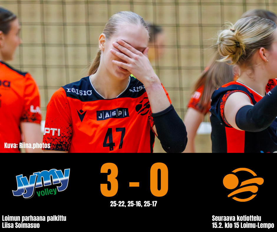 Kahden erän jälkeen näytti siltä, että Loimu porskuttaa selvään voittoon. Toisin kuitenkin kävi, sillä Jymy-koutsi Joona Antikaisen käärmekeitot tepsivät ja Nurmo kampesi toisen erän selvästi itselleen Loimun erän lopun pyristelyistä huolimatta. Varsinkin Jymyn parhaana palkittu Neea Hautakangas antoi käden laulaa tuhoisasti. Kolmannessa erässä Pinja Vilén tuli kentälle Sofia Vuorion paikalle ja merkkautti itselleen muutaman makoisan torjuntapisteen.